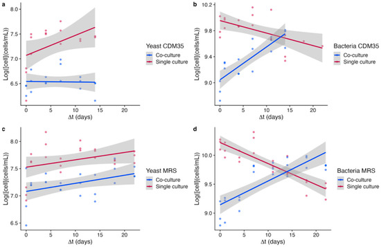 Linear regression model depicting the cell growth in single and co-culture conditions monitored on timescales. Graphs (a,b) represent the growth of yeast and bacteria in CDM35, respectively, whereas graphs (c,d) represent the growth of yeast and bacteria in MRS. Data were logarithmized and fit a linear model, using R’s Stats package. Cell concentration was reported on the y-axis, while time variation in days was reported on the x-axis.