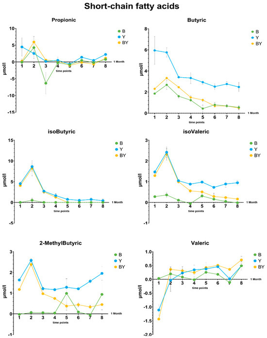 Short-chain fatty acid production is represented as line charts by yeast and bacteria co-cultures compared to single cultures in CMD_35. The production of the six SCFAs is shown as concentrations (μmol/L) for each of the eight time points from the three different culture conditions (B, bacterial culture; Y, yeast culture; BY, co-culture) in CDM35. Concentration values of the media alone (CDM35) were subtracted from the value of each point. Line charts show means + SDs. Statistical analysis (two-way ANOVA) is shown in Supplementary Materials Table S3.