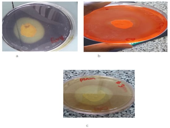 Halo zones around the colony indicating production of (a) amylase, (b) cellulase, and (c) pectinase screening.