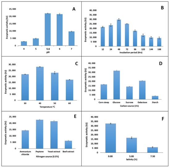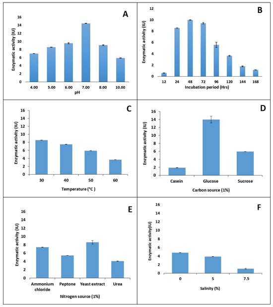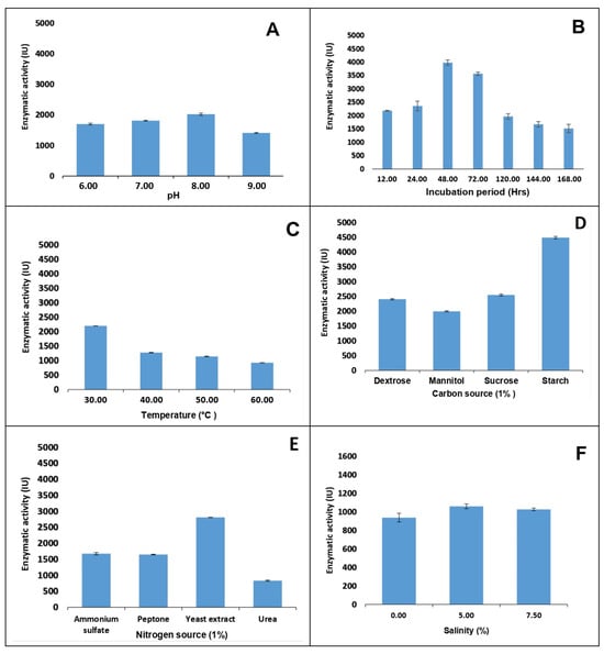 (A) The effect of pH, (B) incubation period, (C) temperature, (D) carbon source, (E) nitrogen source, and (F) salinity on amylase production by B. paranthracis MHSD3.
