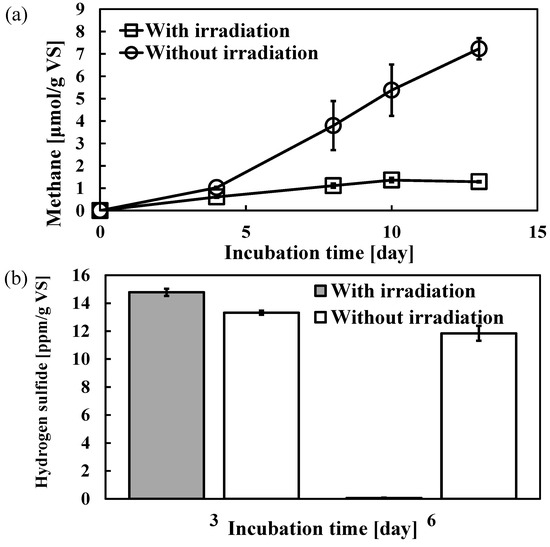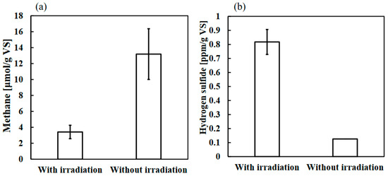 Figure 5a shows the acetoclastic methanogen activity in each sample after 7 days of incubation with or without photo-irradiation. The results showed that the amount of methane with respect to the photo-irradiation sample and the control sample was 3.4 ± 0.8 vs. 13 ± 3 μmol/g VS, and the methane production of the photo-irradiation sample was 3.9 times lower than that of the control sample despite an equal amount of substrates (Figure 5a). No differences between the photo-irradiation sample and the control sample were observed during hydrogenotrophic methanogenesis, which produces methane using hydrogen as a substrate. The low concentration of acetate in the photo-irradiation sample (Figure 4b) may also cause reduced acetoclastic methanogen activity. Hence, it was confirmed that photo-irradiation particularly reduced acetoclastic methanogen activity. In addition, Figure 5b shows sulfate-reducing bacterial activity in each sample after 7 days of incubation with or without photo-irradiation. Interestingly, the hydrogen sulfide production of the photo-irradiation sample from an equal amount of substrate was 6.5 times higher than that of the control sample (Figure 5b). This result indicated that despite the markedly reduced amount of hydrogen sulfide present in the photo-irradiation sample (Figure 1b), sulfate-reducing bacteria were not affected by photo-irradiation. This result is consistent with a previous report that sulfate-reducing bacteria are not killed by only the light irradiation [44]. From these results, the effect of photo-irradiation on anaerobic digestion is summarized in Figure 6.