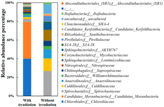 Dynamics of the bacterial community at 13 days of anaerobic digestion in WSS samples with or without photo-irradiation. Relative abundant percentages of the dominant bacterial community indicated by the order or family level.
