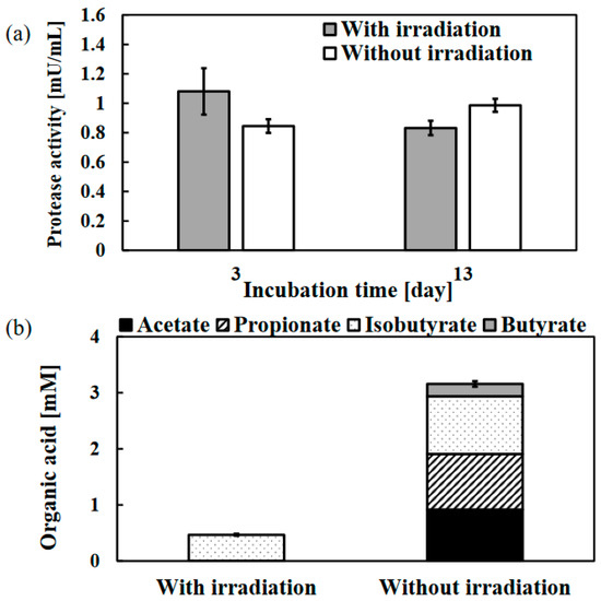 It was described earlier that methane production in 5% WSS was reduced via photo-irradiation (Figure 1a). The anaerobic digestion process using WSS mainly consists of three stages: the (a) hydrolysis stage, (b) acidogenesis stage, and (c) methanogenesis stage [13]. To clarify the suppression mechanism of methane production via photo-irradiation, the hydrolysis, acidogenesis, and methanogenesis stages during methane production using WSS were evaluated. Since proteins are the main components of WSS [12], protease activity was first measured to evaluate the hydrolysis stage.
