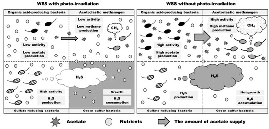 Since diverse microorganisms are present in WSS, the microorganisms are thought to establish direct or indirect relationships (such as mutualism, predation, parasitism, competition, commensalism, suppression, and neutralism) with each other [45]. Revealing the various bacterial interactions present in environmental samples is important because it provides new considerations: the effects and inter-relationships with respect to four microbial groups (organic-acid-producing bacteria, acetoclastic methanogen, sulfur-reducing bacteria, and green sulfur bacteria) via the photo-irradiation of the anaerobic digestion system. Firstly, it is noted that the purpose of these microorganisms is not to produce each metabolite (acetate, methane, and hydrogen sulfide) but to obtain energy using the metabolic pathways via which each metabolite is produced. As shown in Figure 4b, photo-irradiation significantly suppressed the accumulation of organic acids, and this suggests that photo-irradiation reduced the activity of organic-acid-producing bacteria. Therefore, it also caused a decrease in the concentration of acetate in the WSS (Figure 4b). Next, the reduced concentration of acetate in the WSS may have created an adverse environment for acetoclastic methanogens, which use acetate as a substrate to produce methane. Hence, methane production and acetoclastic methanogen activity in the photo-irradiation sample decreased (Figure 1a and Figure 5a). In addition, the decrease in the activity of these microbial groups may have increased the relative amount of nutrients available to the sulfate-reducing bacteria in the WSS. Therefore, the activity of sulfur-reducing bacteria was high in the photo-irradiation sample (Figure 5b). However, the hydrogen sulfide produced by sulfur-reducing bacteria was consumed during the anoxygenic photosynthesis of green sulfur bacteria, and their growth was promoted via photo-irradiation. Thus, the amount of hydrogen sulfide was low in the photo-irradiation sample (Figure 1b).