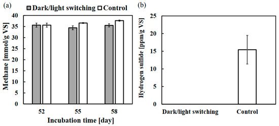 As mentioned above, the photo-irradiation of the anaerobic digestion system was shown to significantly reduce not only methane but also hydrogen sulfide. Since the presence of hydrogen sulfide during anaerobic digestion has a negative impact on methanogenesis efficiency [44], the removal of hydrogen sulfide is essential in long-term anaerobic digestion processes in order to protect against metal corrosion [46]. However, adversely affecting methanogenesis is undesirable because methane gas is a type of biogas [5]. Therefore, the amount of methane should be maintained but that of hydrogen sulfide can be removed. Hence, the practical usage of dark/light switching for anaerobic digestion using WSS was investigated. After 52 days of anaerobic digestion without photo-irradiation, the WSS samples were further incubated under light conditions. As a result, there was no reduction of hydrogen sulfide (the color of vials did not turn green). On the other hand, the supply of WSS with green sulfur bacteria and photo-irradiation was only able to reduce hydrogen sulfide while methane contents almost remained the same (Figure 7). Compared to the sample of WSS after 58 days of anaerobic digestion without photo-irradiation (control sample), no change in the amount of existing methane levels in the dark/light switch sample was observed after 6 days of incubation (Figure 7a). In addition, the amount of hydrogen sulfide at 58 days of incubation was not detected in the sample with respect to dark/light switching, even though the control sample contained 15 ± 4 ppm/g VS of hydrogen sulfide (Figure 7b). Thus, dark/light switching in long-term anaerobic digestion may only efficiently remove hydrogen sulfide without affecting the produced methane. However, continuous methane production during short-term anaerobic digestion was suppressed via photo-irradiation (Figure 1a). In addition, since hydrogen sulfide in anaerobic digestion causes the corrosion of the digester tank, its early removal is desirable [47]. Therefore, an anaerobic digestion switching system with respect to photo-irradiated and non-photo-irradiated WSS is proposed, and it should be further investigated in the future. Our previous research study reported efficient hydrogen sulfide removal in a contactless anaerobic digestion system using inorganic materials [27].
