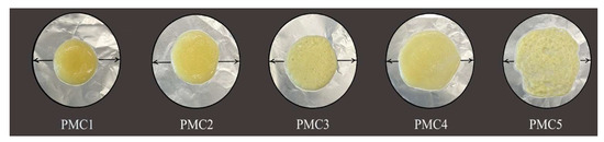 34]. Data obtained showed that the samples with WPC added (PMC4 and PMC5) showed higher (