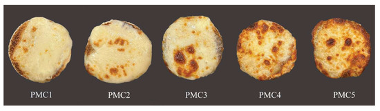 p < 0.05) decrease in the lightness value (more browning) and an increase in redness (+a*) and yellowness (+b*). The samples with WPC added (PMC4 and PMC5) recorded the lowest values of lightness (54.12 and 51.23, respectively) and the highest values of redness (17.49 and 18.78, respectively) and yellowness (35.33 and 38.21, respectively), compared to the samples with SMP added. The browning of PMC is caused by the Maillard reaction and is closely related to its baking. Also, browning and blistering are important quality characteristics for a pizza’s baking performance [