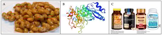 Traditional Japanese fermented food—natto. (A) Edible natto. (B) The three-dimensional structure of nattokinase. (C) Commercially available nattokinase products.