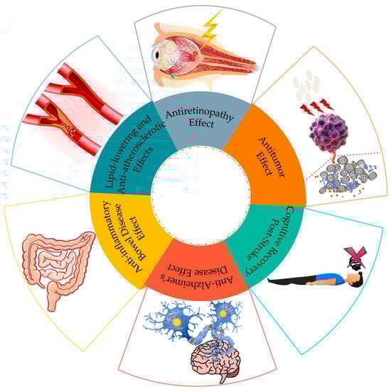 Retinopathy can arise from various etiologies, including diabetic retinopathy (DR) due to hyperglycemia, retinal vascular disorders that stem from hypertension or arteriosclerosis, and retinal vein occlusion [44,45]. Pathological neovascularization in the retina is a prevalent complication. Nuclear factor-erythroid 2-related factor-2 (Nrf2) and its downstream target heme oxygenase-1 (HO-1) play a role in promoting reparative vascular regeneration while regulating inflammation and oxidative responses [46]. In a murine model of oxygen-induced retinal pathology, nattokinase attenuates neuroinflammation and inhibits pathological neovascularization by activating the Nrf2/HO-1 signaling pathway and modulating neuroglial activation [45]. For diabetic macular edema, commonly employed treatments involve injections of anti-vascular endothelial growth factor agents or corticosteroids, but there are still side effects such as drug resistance, macular ischemia, and disease recurrence [44,47,48]. Maintaining the integrity of the blood–retinal barrier (BRB) is fundamental in treating DR. Huang et al. [47] demonstrated that nattokinase interferes with downstream signaling by inhibiting the expression of high-mobility group protein 1, thereby enhancing BRB function. This heralds the potential of nattokinase as a prospective alternative medication for treating diabetic retinal pathologies. However, selecting the appropriate delivery route, maintaining nattokinase activity, and determining the optimal dosage remain unresolved issues.