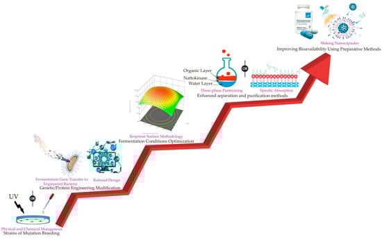 In the pursuit of an industrial-scale production of nattokinase, the enhancement of nattokinase yield emerges as a paramount consideration. The strategies frequently employed encompass the screening and mutagenesis of wild-type microorganisms, thereby utilizing genetic engineering techniques to engineer the nattokinase gene, as well as the optimization of fermentation media and cultivation parameters. Furthermore, ensuring the stability and efficacy of nattokinase during its purification and preparation process is also of paramount importance (Figure 3).