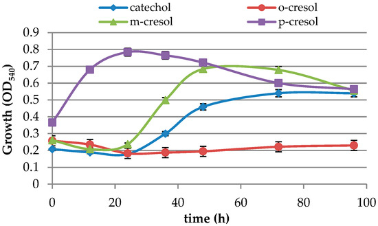 | Strains | Catechol | o-Cresol | m-Cresol | p-Cresol |