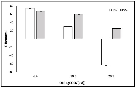 As the HRT decreased, there was an increase in the concentration of TSS and VSS, as indicated in Table 3. In general, it was found that the reduction of VSS in the system exceeded 60% during HRT of 8 h and 5 h for different OLR. The efficiency of AD treatment can be evaluated by examining the reduction of solids, as shown in Figure 2. According to the literature, the removal efficiency of TSS is reported to be around 70% for HRT of 8–6 h, which is consistent with the values observed in Figure 2 [34]. The removal efficiency of TSS decreased from 74.3% to 29.9% as the OLR increased from 6.4 to 10.3 gCOD/(L·d), and it even reached negative values when the OLR reached 20.5 gCOD/(L·d). The increase in the OLR, and consequently the higher upflow velocity, may be associated with a rise in the particles being dragged into the effluent due to the entrainment of the accumulated particles in the sludge bed. Therefore, an increase in OLR resulted in a decrease in TSS and VSS reduction, as reported in other studies [17], suggesting system instability, as previously discussed for other parameters. Furthermore, it can be observed that VSS/TSS in the effluent exhibits a linear correlation, increasing as HRT decreases, as per Equation (1) with a R2 = 0.97.