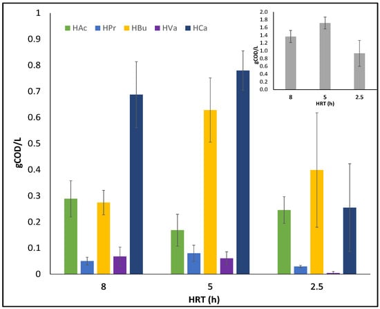 Finding the optimum HRT is essential for achieving the highest possible production yield. Working at higher HRTs could be advantageous for VFA production as microorganisms have more time to react and hydrolysis is favoured. However, prolonged HRT could lead to disruption of VFA production and growth of undesirable microorganisms in the AF, such as archaea, which degrade VFAs. Therefore, acetogenesis and methanogenesis must be prevented in order for VFAs to accumulate [11,17]. As can be seen in Figure 3, when the HRT is augmented from 2.5 h to 5 h, there is a 46% increase in TVFA production, but when HRT is extended from 5 h to 8 h, there is only a 26% increase. Regarding the amount of VFA produced relative to feed (OLR), the %COD to VFA increased with increasing HRT and was 5%, 17%, and 21% for 2.5 h, 5 h, and 8 h HRT, respectively.