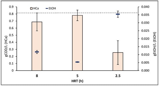 This suggests that the use of EtOH for CE, as proposed in previous studies, aligns with our results. For the maximum concentration of HCa at 5 h HRT, the presence of EtOH in the medium is negligible (Figure 4). It can be observed that the initial EtOH concentration has been reduced by approximately 68% for the 8 h HRT and 85% for the 5 h HRT. However, for the 2.5 h HRT, its reduction is negligible and the production of HCa for this time also decreases by 67% compared to the maximum obtained at 5 h HRT. EtOH acts as an ED and is assimilated by microbial consortia, which use it to produce VFAs, particularly favouring the production of MCFAs. Among the well-studied genera in this context, C. kluyveri stands out, as it can use EtOH as an ED to produce long-chain VFAs. Similarly, the genus Megasphaera elsdeni demonstrates the ability to employ lactate for the same purpose [20].
