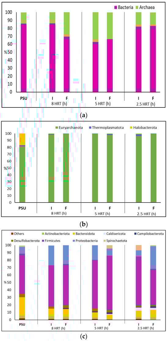 (a) Evolution of the percentage abundance of Archaea versus Bacteria at each HRT; (b) Evolution of the percentage of abundance of the Phylum Bacterium in each HRT; (c) Evolution of the percentage of abundance of the Phylum Archaea in each HRT. (PSU (Pre-Start-Up), I (Intermediate), and F (Final)).
