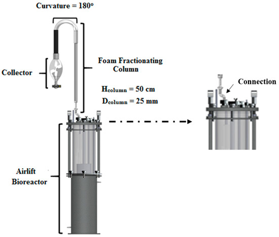 Figure 1 depicts the experimental apparatus used for the production and simultaneous separation of the biosurfactant. The biosurfactant production was carried out in a bioreactor airlift (Tecnal TecBio V) (Piracicaba, SP, Brazil) with 7.0 L of total capacity, containing 6.0 L of culture media as the working volume. In order to separate the produced biosurfactant simultaneously, a foam fractionation column with a height of 50 cm and an internal diameter of 25 mm was vertically integrated onto one of the outputs of the bioreactor. On the top of the column, there was a pronounced curved region of 180°, which facilitated the collection of the air-entrained foam. Foam bubbles spontaneously rupture, primarily due to the effects of gravity, allowing the liquid to flow towards the bottom of the container. The liquid is then collected as a sample for analysis.