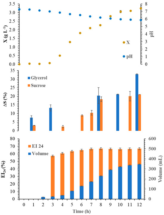 The pH drops as the fermentation progresses, probably due to the organic acids formed from the metabolism of the carbon source [44,45]. Carbohydrate consumption increases throughout fermentation, but does not exceed 31.9% of glycerol and 21.1% of sucrose. According to Das et al. [46], media containing sucrose are more suitable for microbial growth, while media formulated with glycerol are more suitable for producing biosurfactants. Therefore, the bacterium has an excessively long growth lag phase (3 h), after which the microorganism begins the exponential growth phase (3 to 10 h), then finally enters a stationary growth phase until the end of fermentation (12 h).