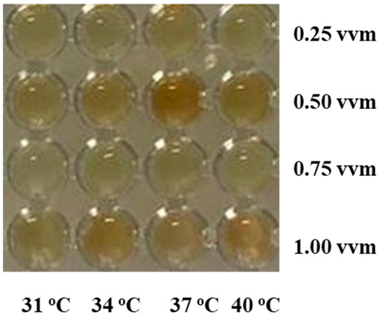 The methodology developed by Ong and Wu [31] was used to infer the probable type of the biosurfactant produced using B. atrophaeus. The identification is based on the spatial arrangement of amino acids present in the biosurfactant molecule and, consequently, on the different coloration caused by the presence of bromothymol blue. Using this protocol, the identity of surfactin is confirmed by a blue color, fengycin by green, and iturin by yellow. In all working conditions, the reaction presented staining ranging from the darkest to the lightest yellow hue, denoting the probable presence of iturin (Figure 3). Wan et al. [48] reported the iturin production from different species of Bacillus.