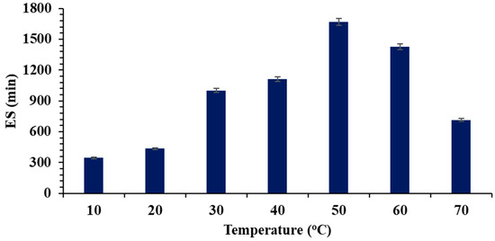 The industrial use of biosurfactants depends on their stability under different operational conditions, mainly temperature and pH [55]. Therefore, the stability study was carried out over a wide range of temperatures (10–70 °C) and pH (5–10), as shown in Figure 5 and Figure 6. For the ES measurement, the EA was evaluated every 10 min for 1 h (Figures S1 and S2 of the Supplementary Materials).