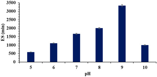 The pH plays an important role in the stability of the biosurfactant. It is noted that at neutral pH, the ES values are low and increase with the alkalinity of the medium. According to Khopade et al. [43], pH value has a positive effect on the stability of the formed oil–water emulsions, as alkaline pH causes an improvement in the stability of the fatty acids in the biosurfactant, and the presence of NaOH precipitates secondary metabolites. On the other hand, in an acid medium, biosurfactants tend to coalesce and precipitate, decreasing the ES. However, at more alkaline pH values (pH = 10), a severe reduction in the stability of the biosurfactant is also observed.