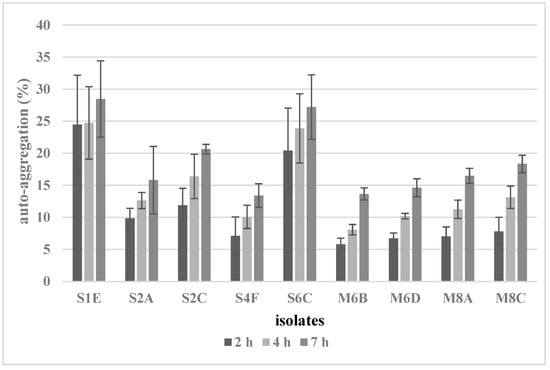 Auto-aggregation is an important probiotic ability that helps reduce pathogen colonization. In this study, the auto-aggregation of the tested isolates was observed at 2, 4, and 7 h (Figure 2). The auto-aggregation abilities of isolates had a variable range between 5.8 and 28.5%, depending on incubation time and strain. Lacticaseibacillus rhamnosus S1E and S6C showed the strongest percentages of auto-aggregation (28.5% and 27.2%) after 7 h.