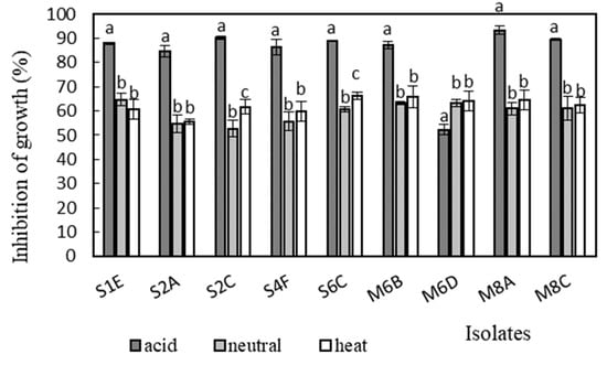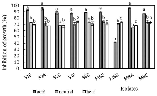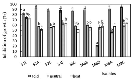 Antimicrobial activity of isolates against E. coli CCM 3954. Data with different superscripts (a–c) are significantly different (p < 0.05).