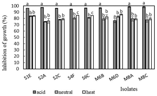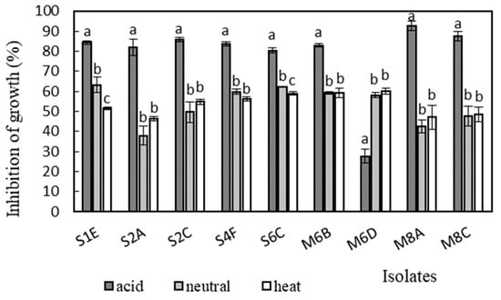 Antimicrobial activity of isolates against Salmonella enterica serotype Typhimurium CCM 7205. Data with different superscripts (a–c) are significantly different (p < 0.05).