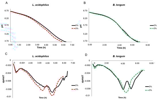 Acidification kinetics. pH vs. time (h) curve depicting the acidification by Streptococcus thermophilus, Lactobacillus delbrueckii subsp. bulgaricus, and Lactobacillus acidophilus (A) or Bifidobacterium longum (B) in soy-based fermented beverage at 42 °C until reaching pH 4.7. Behavior of the derivative of pH with respect to time during fermentation by S. thermophilus, L. delbrueckii subsp. bulgaricus, and L. acidophilus (C) or B. longum (D) at 42 °C.