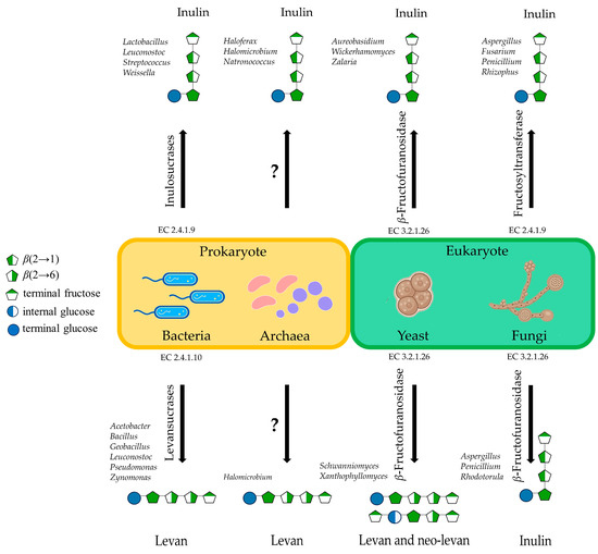 Microbial enzymes with fructosyltransferase activity present in archaea, bacteria, filamentous fungi, and yeast [46,61,72,77,78,79,80,81,82,83,84,85,86,87,88,89,90,91,92,93,94,95,96,97], and chemical structures were drawn following López and Salomé-Abarca nomenclature [98]. The arrows indicate the type of fructan produced by bacteria, archaea, yeast, or fungi. The question mark indicates that no enzyme identification has been performed for the reported fructan molecule.