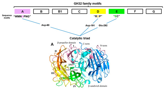 So far, the most structurally characterized enzymes belong to the GH-J clan. The enzymes of these clans possess proteins with an N-terminal five-bladed β-propeller domain present in GH32 and GH68 and a C-terminal domain constituted by two β-sheets, which is only present in GH32 [162]. The secondary structure of microbial GH32 proteins possesses eight conservated domains, the so-called A, B, B1, C, D, E, F, and G domains. Domains A, D, and E are conserved acidic residues in the active site of the enzymes [163]. The sequence analysis of members of the GH32 indicates that three conserved acidic amino acids, so-called Asp-60, Asp-191, and Glu-292, are key structural components in the active site of these enzymes (Figure 2). They are called the catalytic triad, and they are considered the catalytic nucleophile, the transition-state stabilizer, and the general acid/base catalyst, respectively [162,164]. The Asp-60, Asp-191, and Glu-292 residues belong to the three conserved sequences referred to as WMNDPNG or β-fructosidase, RDP, and EC motifs, respectively [161]. Figure 2 shows that Asp-60, Asp-191, and Glu-292 are situated at the first β-strand of blades (I, III, and IV, respectively). They are located at the active site on the bottom of the cavity in the center of the β-propeller domain [164]. Invertases usually possess an intact A motif (WMNDPNG), while FTs display structural alterations in this motif [162].
