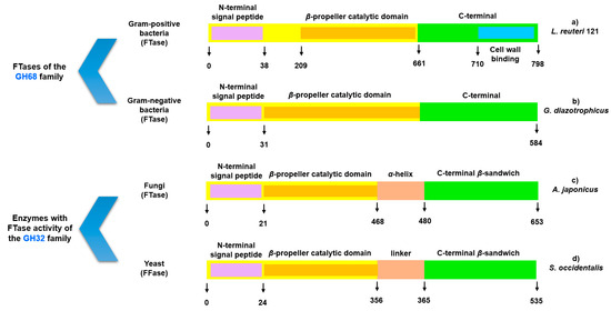 Graphical representation of the structural organization of enzymes with fructosyltransferase activity. Each letter indicates an amino acid sequence with different length coming from diverse microorganisms, the colors indicate distinct regions, and the black arrows the residual amino acids number. Data was compiled from (a) [166] and (b–d) [164,169,170]). “https://creativecommons.org/licenses/by/4.0/legalcode (accessed on 29 October 2023)”.
