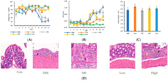 Effect of LP+Ly on the symptoms of colitis in UC mice. (A): The body weight changes. (B): DAI. (C) The colon tissue length (different letters indicate significant differences, p < 0.05). (D) typical H&E stained tissue sections in representative mice from each group (×400, scale bars: 5 μm, at the arrow: ulcerative focus (↑), necrotic enteric gland (↑), neutrophil (the most common type of white blood cell) (↑), lymphocyte (↑), fibroblast (↑)).