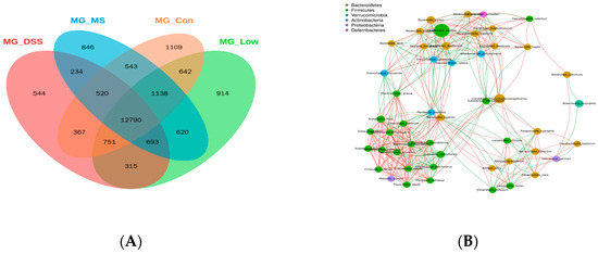 As shown in Figure 3A, at the species level, a total of 12,790 microbial species are shared across all groups. The DSS group possesses 544 unique species, the Con group has 1109 unique species, the Low group has 914 unique species, and the MS group has 846 unique species. Figure 3B indicates that dominant species in the phylum Firmicutes, including Lactiplantibacillus murinus, Faecalibaculum rodentium, Firmicutes bacterium, and Lachnospiraceae bacterium, exhibit close relationships and positive correlations with other species. Conversely, dominant species in the phylum Actinobacteria, such as Enterorhabdus mucosicola, Enterorhabdus caecimuris, Asaccharobacter celatus, and Parvibacter caecicola, demonstrate negative correlations with other species. LEfSe analysis results, from phylum to species, reveal the enrichment of specific taxa at varying taxonomic levels (Figure 3C). In the Con group, there is enrichment in Lactobacillus, Lactobacillus ruminis, and Lactobacillaceae. The DSS group exhibits enrichment in Bacteroides acidifaciens, Akkermansia muciniphila, and Mucispirillum schaedleri at the genus and species levels. In the MS group, there is enrichment in Eggerthella and Akkermansia municiphila. The Low group displays enrichment in Eubacterium rectale, Anaerostipes, and Prevotella at the genus level. Additionally, Turicibacter, Bacteroides, Holdemania, and Dysgonomonas have been identified as positively associated with colitis-related inflammation [12,13,14,15].