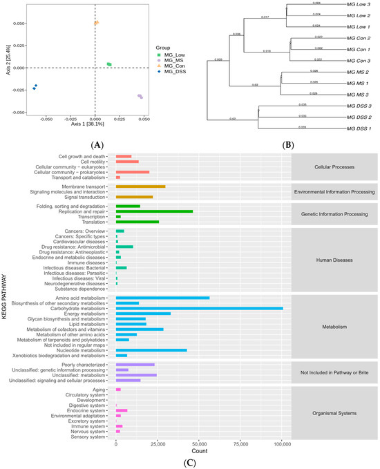 Functional analysis of the gut microbiota. (A) PCoA analysis showing two dimensional ordination of samples. (B) UPGMA cluster analysis. (C) KEGG metabolic pathway analysis.