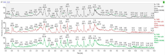 The total ion chromatogram (TIC) of the QC samples is displayed in Figure 5 (the negative [neg] ion spectrum of QC is shown in Figure A1).