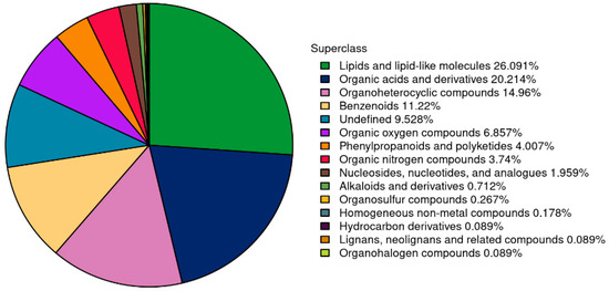 Figure 6 demonstrates that a total of 1123 metabolites were identified, comprising 631 metabolites in the pos mode and 492 metabolites in the neg mode. Based on the classification into chemical groups, 293 metabolites were categorized as lipids and lipid-like molecules, 227 metabolites as organic acids and derivatives, 126 metabolites as benzenoids, and 45 metabolites as phenylpropanoids and polyketides, among others.