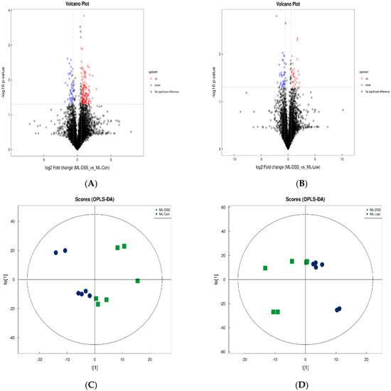 Presents the volcano plots and OPLS−DA analysis in pos. (A) DSS vs. Con; (B) DSS vs. Low; (C) DSS vs. Con; (D) DSS vs. Low; (E) shows the permutation test results for the comparison between DSS and Con groups, and panel (F) represents the permutation test results for the comparison between DSS and Low groups.