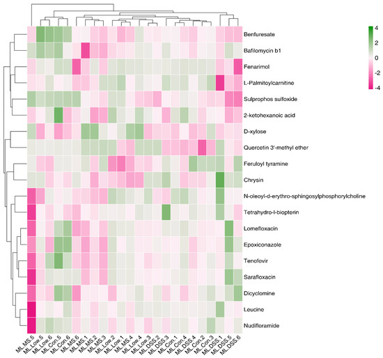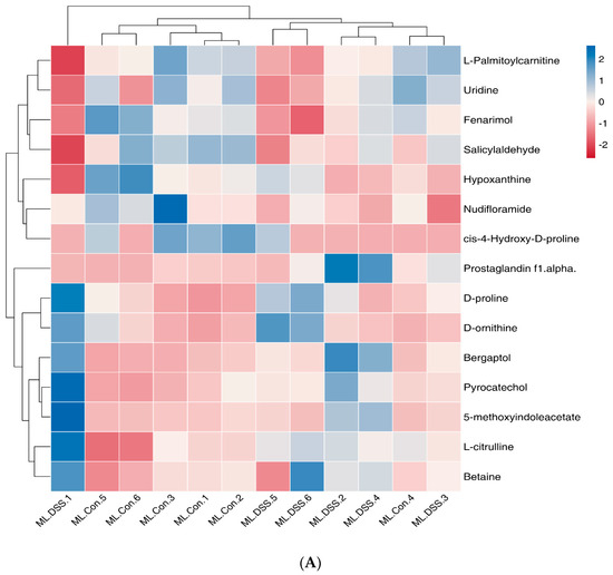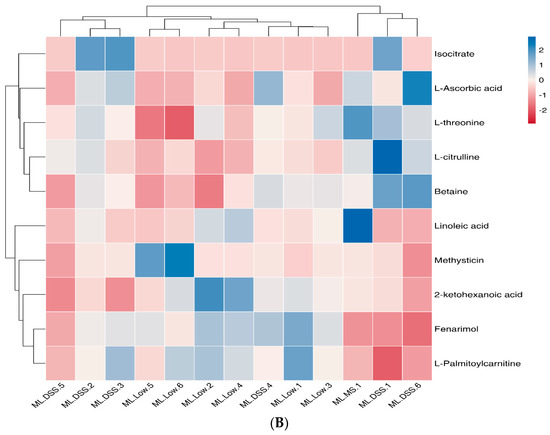 According to Figure 7A,B, a total of 176 metabolites exhibited significant changes in expression between the Con and DSS groups, with 129 metabolites upregulated and 47 metabolites downregulated. There were 63 differentially expressed metabolites between the DSS and Low groups. Further, by comparing the overlapping differentially expressed metabolites between Con groups vs. DSS groups and DSS groups vs. Low group comparisons, a total of 63 metabolites were identified, 17 of which showed consistent expression patterns in the Con and Low groups. These 17 differentially expressed metabolites can be considered potential target metabolites involved in the alleviation of UC in mice by LP+Ly intervention.