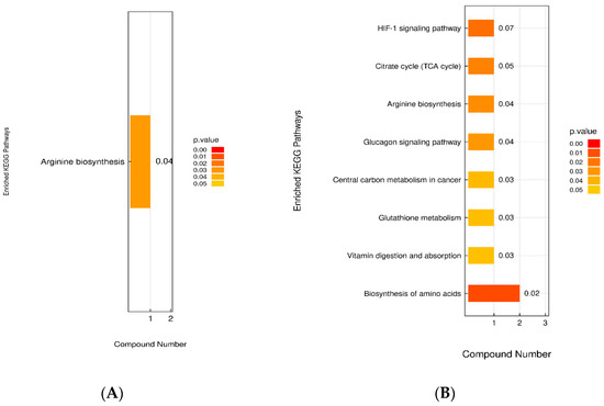 According to the KEGG enrichment analysis in Figure 10, the comparison of the DSS group vs. the Con group shows that six significantly different metabolites map to five Metabolic pathways, including Arginine biosynthesis, Nicotinate and nicotinamide metabolism, and Arginine and proline metabolism, with Arginine biosynthesis being significantly enriched. The enrichment analysis for the DSS group vs. Low group indicates that five significantly different metabolites map to 13 metabolic pathways, including the Biosynthesis of amino acids, Citrate cycle, Arginine biosynthesis, Glucagon signaling pathway, Glutathione metabolism, and Vitamin digestion and absorption, with the first eight pathways being significantly enriched. Thus, it is inferred that these nine metabolic pathways are potential target pathways for the alleviation of UC in mice through LP+Ly intervention. Among them, Arginine biosynthesis, in which the metabolite L-citrulline is involved, exhibits the strongest correlation, and the intake of arginine is vital for suppressing inflammation and carcinogenesis [16]. Please refer to Figure 11 for specific details on metabolic pathways.
