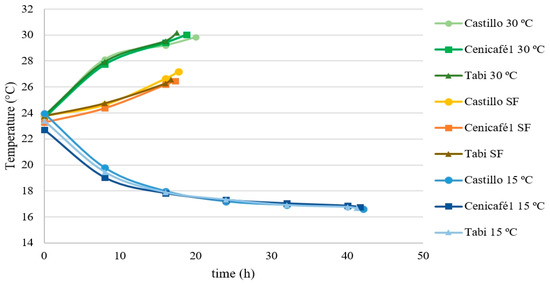 In the spontaneous fermentation (control), the temperature of the coffee mass exhibited an upward trend, reaching close to 26 °C at the end of the process, without differences among varieties. There was a temperature delta (∆T) between 2.8 and 3.4 °C. The temperature of the bioreactor water-jacket neither exceed 29.5 °C when it was controlled at 30 °C, nor was it lower than 16 °C when it was controlled at 15 °C. Therefore, the equilibrium temperature was maintained for an average of 14.7 h for 30 °C and 20.9 h for 15 °C, respectively. These variables increased or decreased depending on the control conditions, with temperature differentials between −5.97 and −7.36 °C for 15 °C and between 6.23 and 6.38 °C for 30 °C (Figure 1).