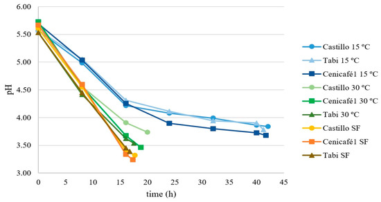 During the first 16 h of fermentation, there was a marked decrease in pH in the three varieties based on the fermentation condition (Figure 2). For the three varieties, the final pH of the fermentations presented the following pattern: the highest final pH for fermentation was at 15 °C, followed by fermentation at 30 °C and spontaneous fermentation, for which the values were below 3.50. Fermentation at 15 °C exhibited asymptotic behavior, maintaining values close to 4.0 for more than 20 h until the end of the process. The Cenicafé1 variety had the lowest pH values in all fermentation conditions.