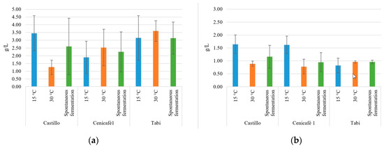 The mean lactic acid concentrations ranged from 0.78 to 1.64 g/L (Figure 3b). The lowest values were obtained for the three fermentations carried out with the Tabi variety. At 15 °C, the lactic acid concentration for the Tabi variety exhibited a significant difference from those for the Castillo and Cenicafé1 varieties. For the control treatments, the lactic acid concentrations ranged from 0.96 to 1.16 g/L, with no significant differences among varieties.