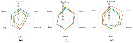 Average attribute scores for the Castillo (a), Cenicafé1 (b) and Tabi (c) varieties under spontaneous fermentation (green line) and temperature-controlled fermentation 15 °C (blue line) and 30° (orange line).