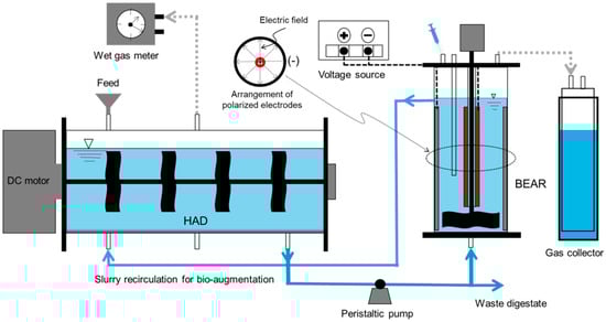 Schematic of a horizontal anaerobic digester (HAD) paired with a bioelectrochemical auxiliary reactor (BEAR).