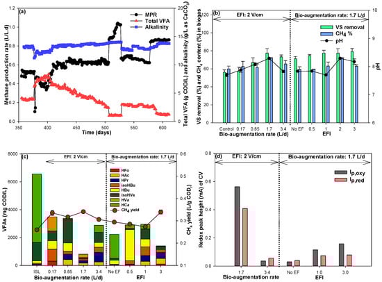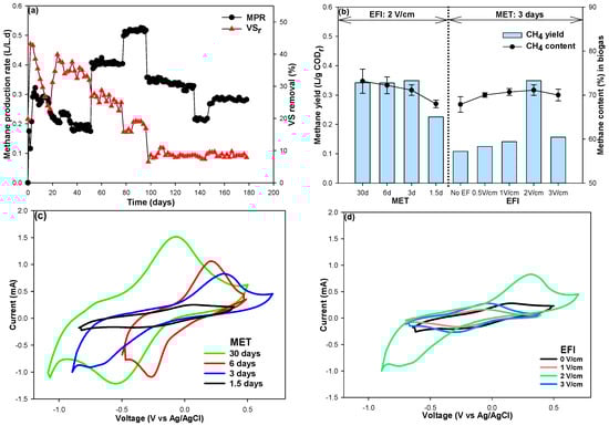 Enrichment of EAMs in the BEAR. (a) MPR and VS removal, (b) methane yield and methane content in biogas, (c) cyclic voltammogram with the MET, (d) cyclic voltammogram with the EFI (EFI: electric field intensity, MET: mean exposure time, MPR: methane production rate, VSr: volatile solids removal).