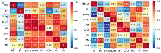 Pearson (lower left triangle) and Spearman (upper right triangle) correlation matrices for (a) BEAR, (b) HAD (BEAR: bioelectrochemical auxiliary reactor, CODr: chemical oxygen demand removal, EFI: electric field intensity, HAD: horizontal anaerobic digester, Ip,oxy: peak height for oxidation, Ip,red: peak height for reduction, MC: methane content in biogas, MPR: methane production rate, MY: methane yield, Qr: bio-augmentation rate, MET: mean exposure time to the electric field, VSr: volatile solids removal).