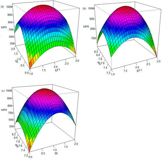 Response surface plot of methane production rate in the HAD for (a) bio-augmentation rate and electric field intensity, (b) pH and electric field intensity, and (c) pH and bio-augmentation rate (BEAR: bioelectrochemical auxiliary reactor, EFI: electric field intensity, HAD: horizontal anaerobic digester, MPR: methane production rate, Qr: bio-augmentation rate through the slurry circulation).