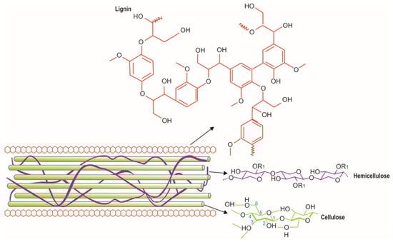 Lignocellulose is a plant biomass available in large amounts, and it is a renewable resource. It is a complex structure primarily composed of the polymers cellulose and hemicellulose (polysaccharides), lignin (a phenolic macromolecule), as shown in Figure 1, and other components, such as proteins, lipids, and inorganic compounds [1,2,3]. These polymers contain cellulose ranging from 35 to 55%, hemicellulose from 20 to 40%, lignin (10–25%) by mass, and other polar and non-polar compounds [4]. The elemental compositions of most lignocellulosic biomass are classified as major elements (e.g., C, H, O, N, K, and Ca), minor elements (Mg, Al, Si, P, Cl, Na, S, and Fe), and trace elements (e.g., Mn and Ti) [5,6].