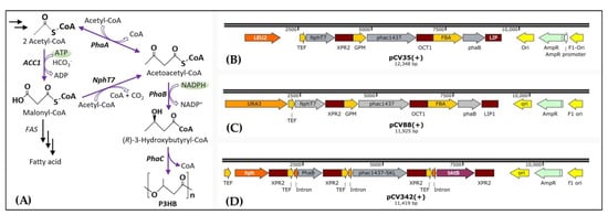 (A) Designed pathways (ABC and NBC) for producing PHB from acetyl-CoA as the main precursor. In ABC pathway, PhaC catalyzes a reversible reaction for condensing two acetyl-CoA molecules to produce acetoacetyl-CoA, while in NBC pathway, acetoacetyl-CoA is synthesized during an irreversible reaction catalyzed by NphT7. (B) Map of pCV35 shuttle vector containing NphT7, phaC1437, and phaB genes; LEU as auxotrophic biomarker; TEF, GPM, and FBA promoters; and XPR2, OCT1, and LIP terminators. (C) Map of pCV88 shuttle vector having similar genes, promoters, and terminators as pCV35, with URA3 as auxotrophic biomarker. (D) Map of pCV342 shuttle vector containing phaB, phaC1437-SKL, and bktB genes; hygromycin as antibiotic biomarker; TEF promoter; and XPR2 terminator.