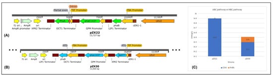 (A) Map of pZX22 vector containing ABC pathway; (B) map of pZX30 vector containing NBC pathway; (C) comparing biomass concentration and PHB accumulation in modified Y. lipolytica strains using ABC and NBC pathways.